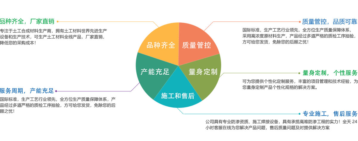 公司所有產(chǎn)品均采用國際標(biāo)準(zhǔn)組織生產(chǎn),并經(jīng)國家、市技術(shù)監(jiān)督局采標(biāo)驗(yàn)收,生產(chǎn)工藝及水平全國領(lǐng)先,屬國內(nèi)優(yōu)等水平,實(shí)物質(zhì)量達(dá)到國際先進(jìn)水平。經(jīng)用戶、施工單位使用證明,質(zhì)量穩(wěn)定可靠、施工方便、價格合理、售后服務(wù)完善。產(chǎn)品主要應(yīng)用于農(nóng)業(yè)、海綿城市建設(shè)、公路、鐵路、垃圾填埋場防滲,水利、電力、水土保持及環(huán)境綠化與基礎(chǔ)建設(shè)領(lǐng)域,已被廣泛應(yīng)用于高速公路、鐵路、垃圾填埋場等多項(xiàng)國家重點(diǎn)工程,受到工程界專家及廣大用戶的一致好評。